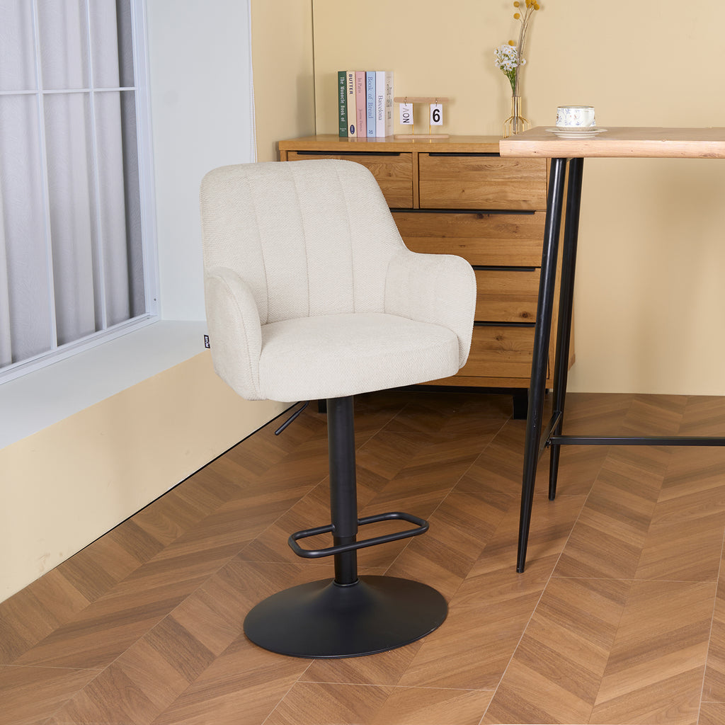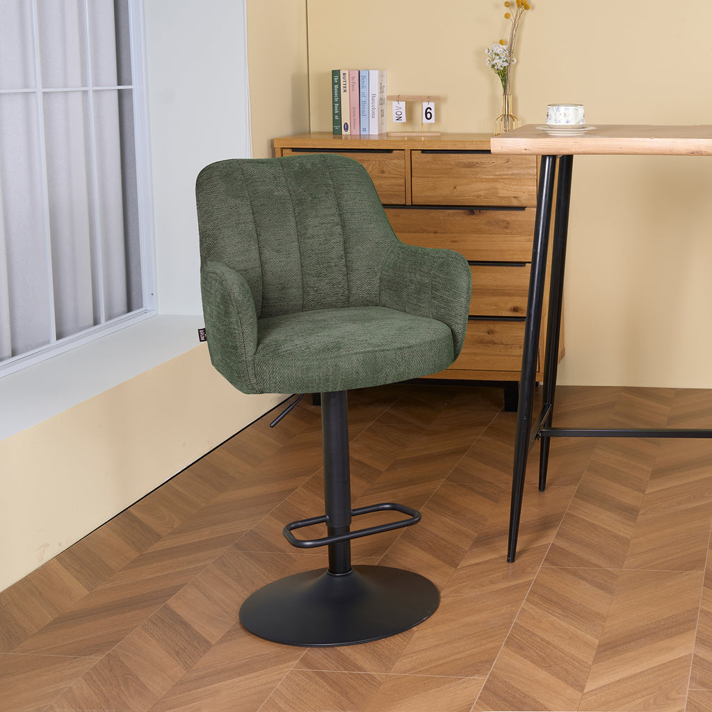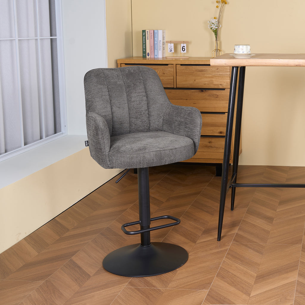 Descubre el Banco Alto Amsterdam, un asiento giratorio que combina estilo contemporáneo con un confort excepcional. Su respaldo curvado y asiento acolchado ofrecen una experiencia envolvente y ergonómica. Incorpora apoyabrazos suaves, reposapiés integrado y un mecanismo de ajuste de altura con giro de 360°, garantizando funcionalidad y estabilidad. Perfecto para barras o desayunadores, su silueta compacta y proporciones equilibradas aportan elegancia y sofisticación a cualquier ambiente. Ideal para disfrutar de comodidad prolongada con un diseño refinado y materiales de alta calidad.