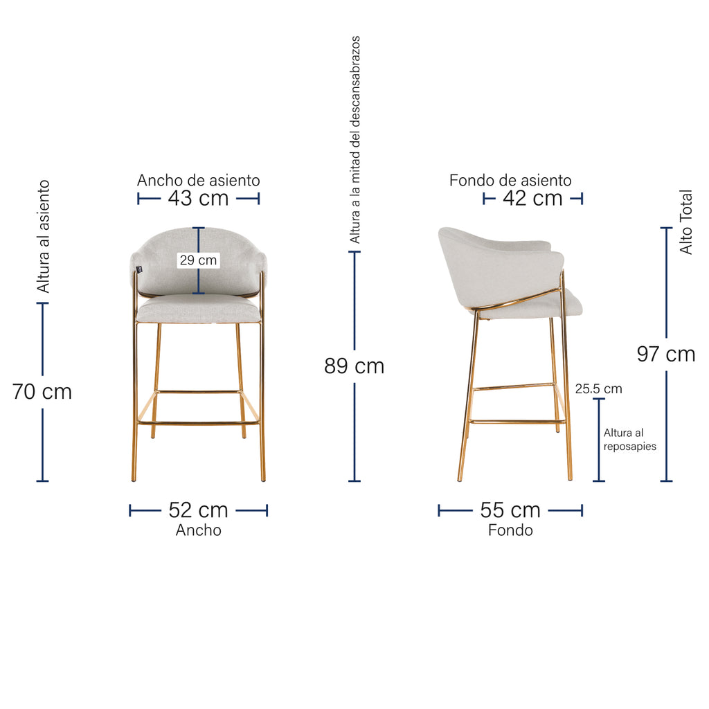 El Banco Berlín redefine la estética moderna con una silueta limpia y proporciones equilibradas. Su estructura metálica en acabado dorado refleja la luz con sutileza, llenando la barra o cocina de un brillo sofisticado y contemporáneo.