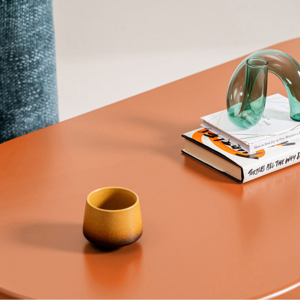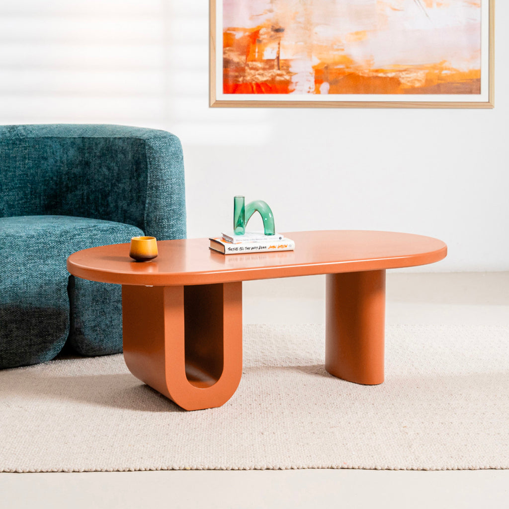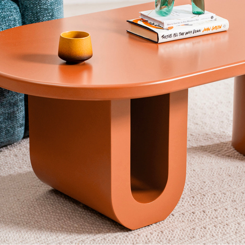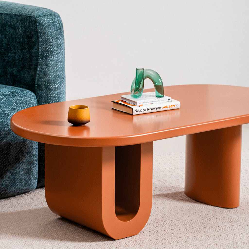 La Mesa de Centro Fortaleza destaca por su silueta orgánica y su presencia escultórica. Su cubierta ovalada y bordes suavemente redondeados generan una sensación visual ligera, mientras que su diseño arquitectónico aporta carácter y personalidad al espacio.