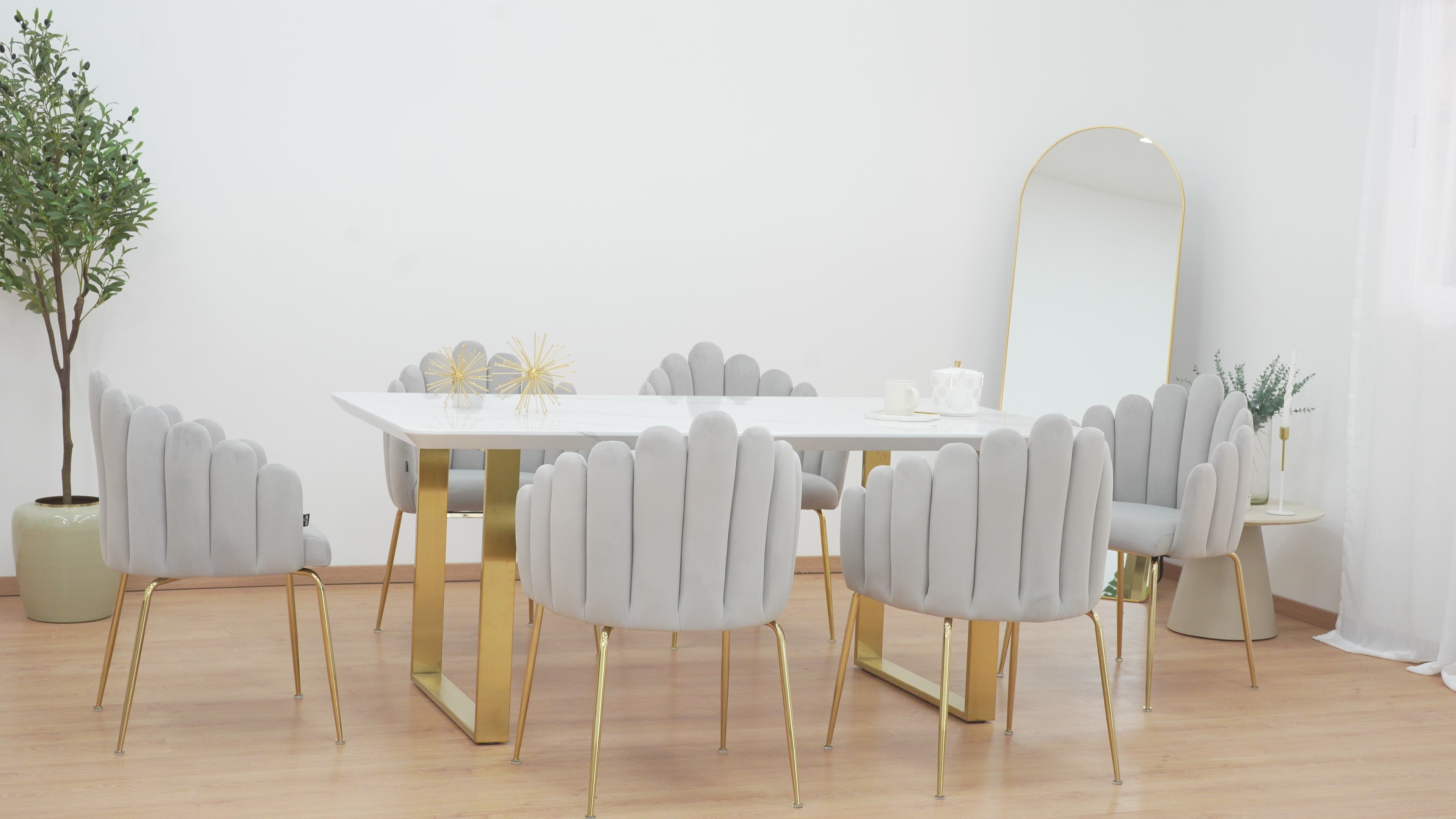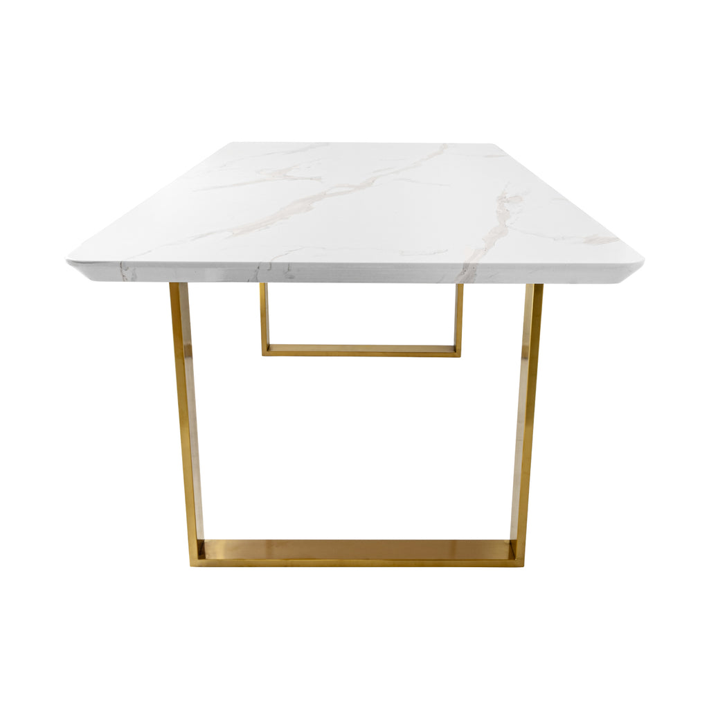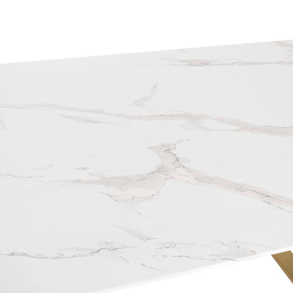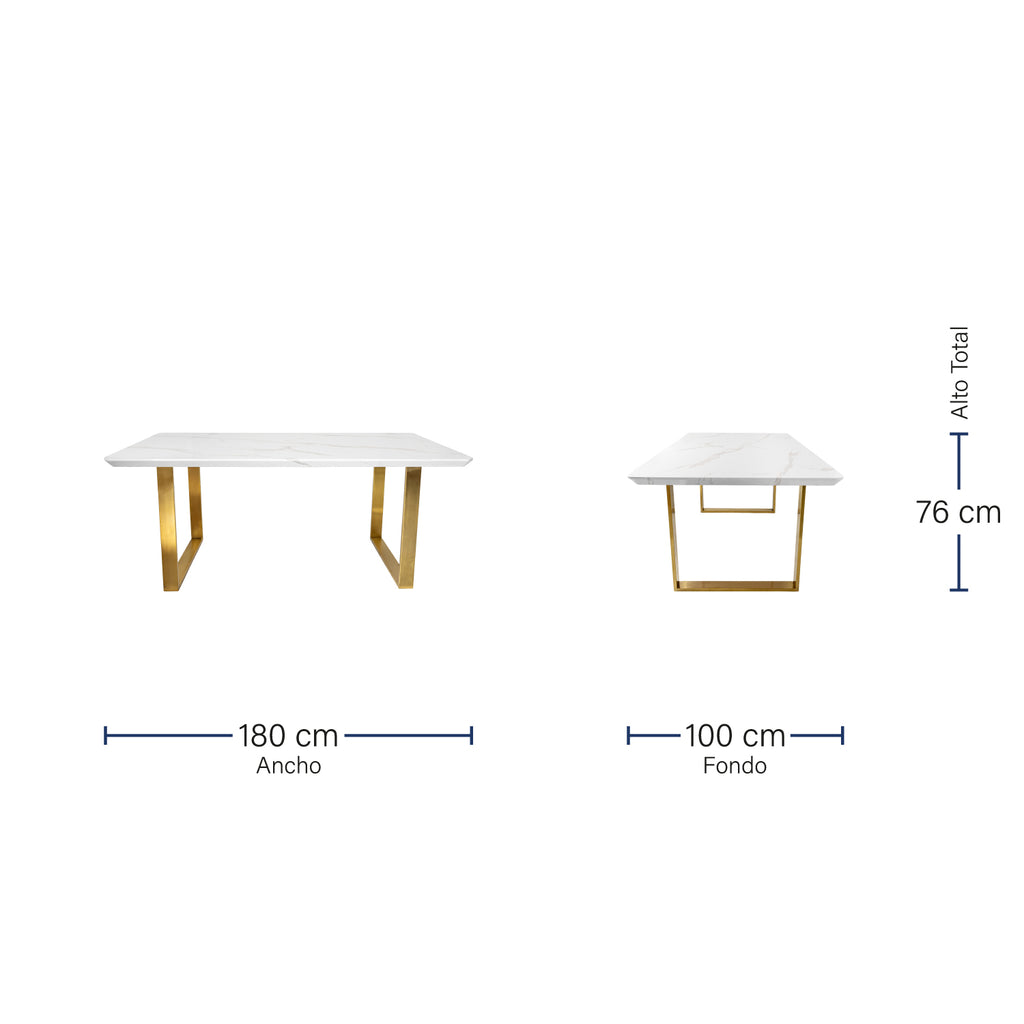 La mesa de comedor Vela es una mesa rectangular excepcional que combina un diseño elegante con la máxima comodidad y funcionalidad. Con su acabado estilo mármol y patas estilo grapa color dorado, brinda un toque de sofisticación a cualquier espacio en el que se coloque.