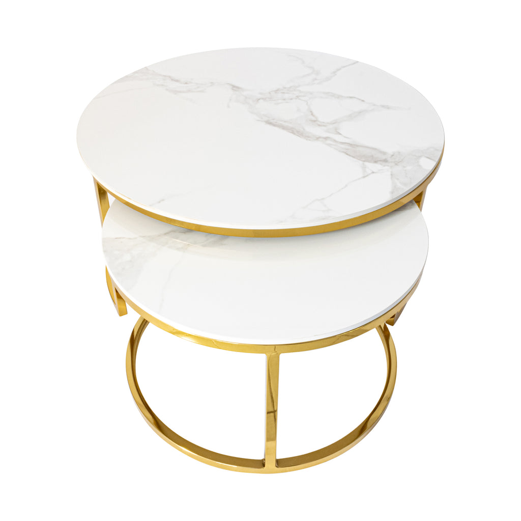 El Set de Mesas de Centro Madison incluye dos mesas elegantes y modernas con estructura de acero cromado y cubierta de cerámica imitación mármol.