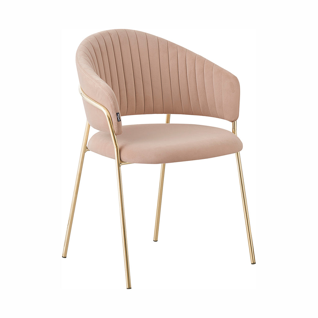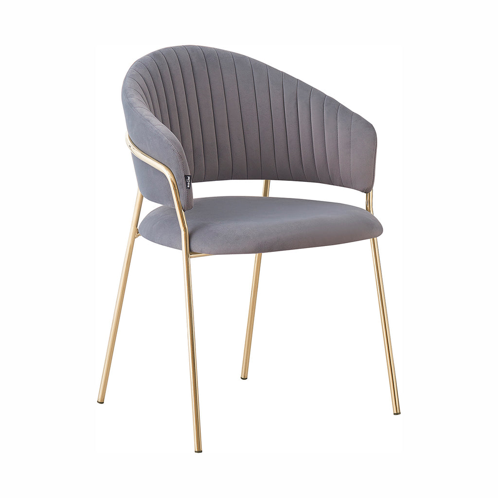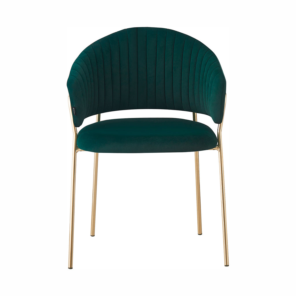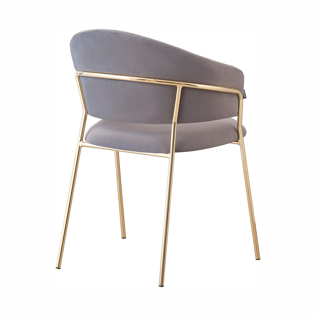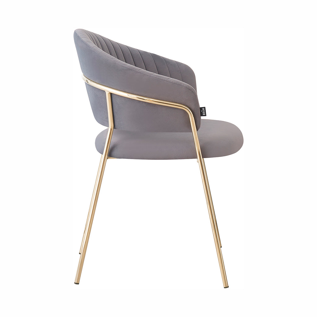 Las patas metálicas en acabado dorado aportan un toque de luz y contraste, convirtiendo a la Silla Bilbao en un punto focal dentro de cualquier comedor o rincón decorativo. La textura aterciopelada del tapizado realza la profundidad del color, generando un juego visual elegante y sutil. En conjunto, sus materiales equilibran lujo, suavidad y practicidad con una presencia ligera y refinada.