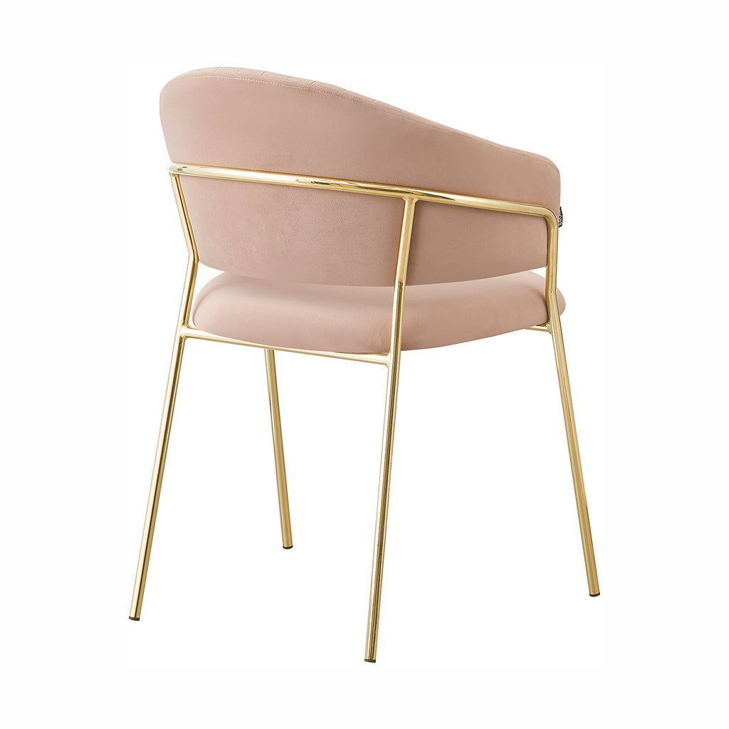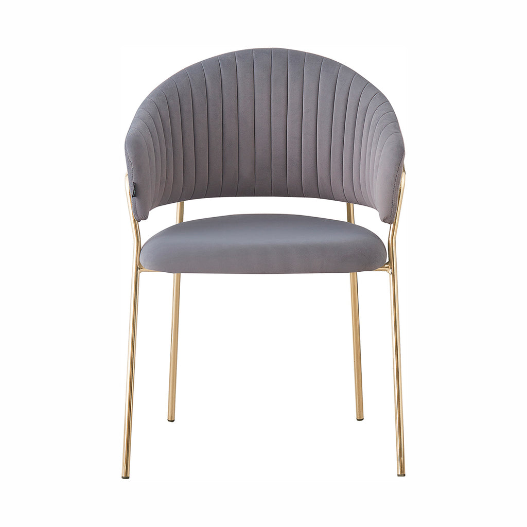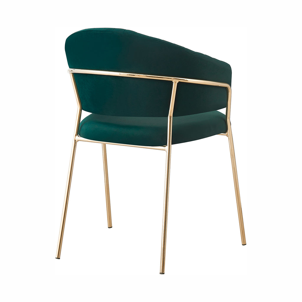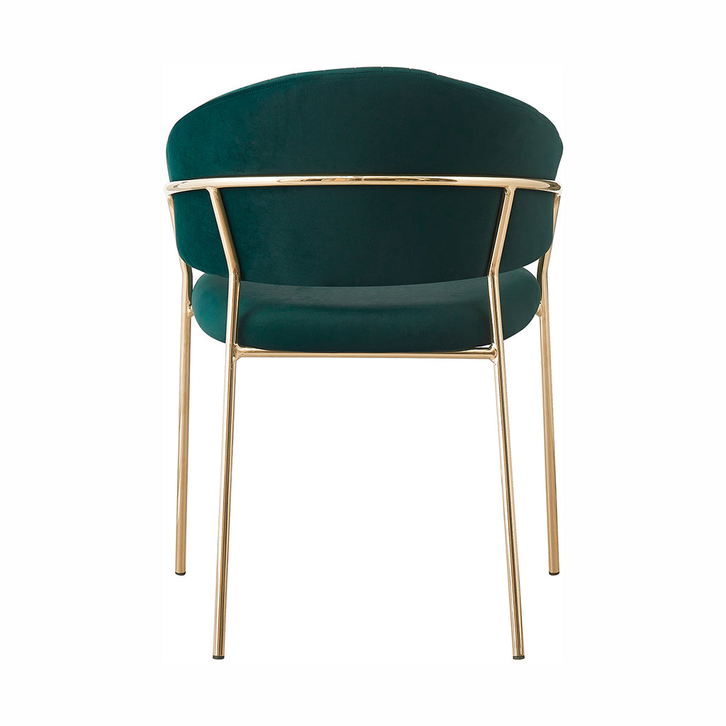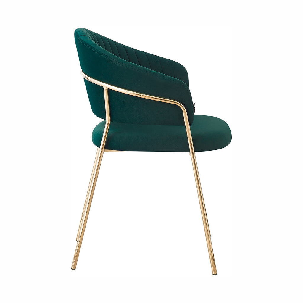 Las patas metálicas en acabado dorado aportan un toque de luz y contraste, convirtiendo a la Silla Bilbao en un punto focal dentro de cualquier comedor o rincón decorativo. La textura aterciopelada del tapizado realza la profundidad del color, generando un juego visual elegante y sutil. En conjunto, sus materiales equilibran lujo, suavidad y practicidad con una presencia ligera y refinada.