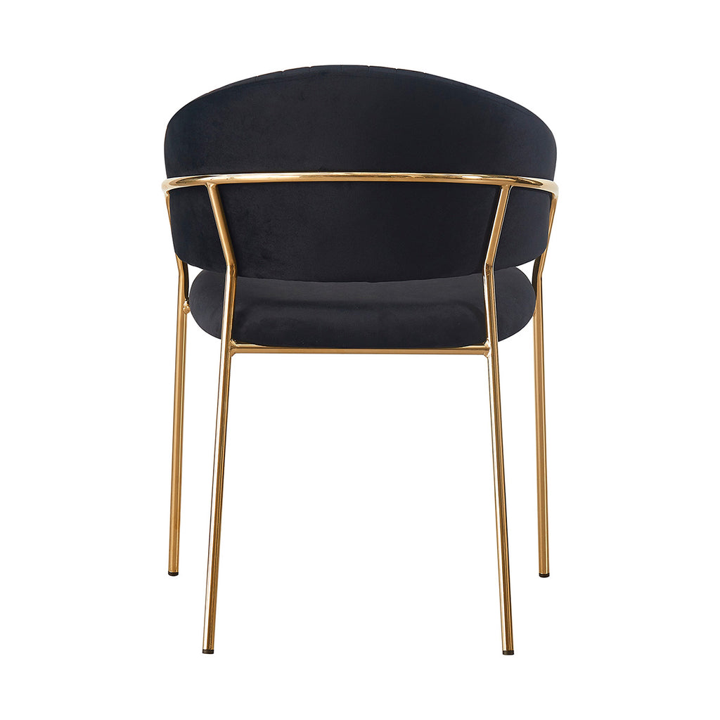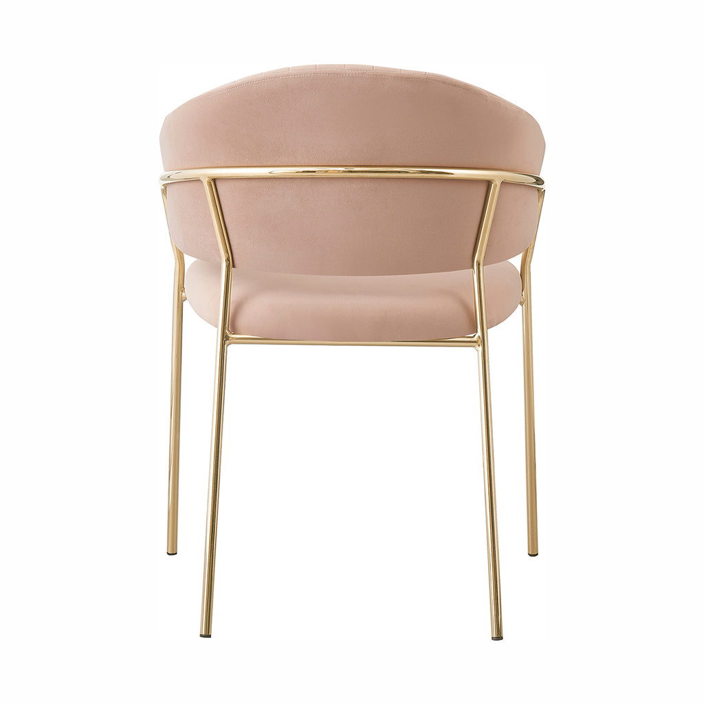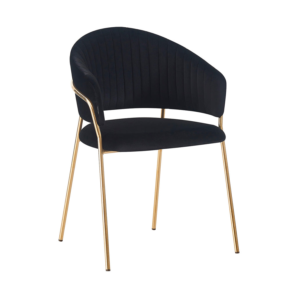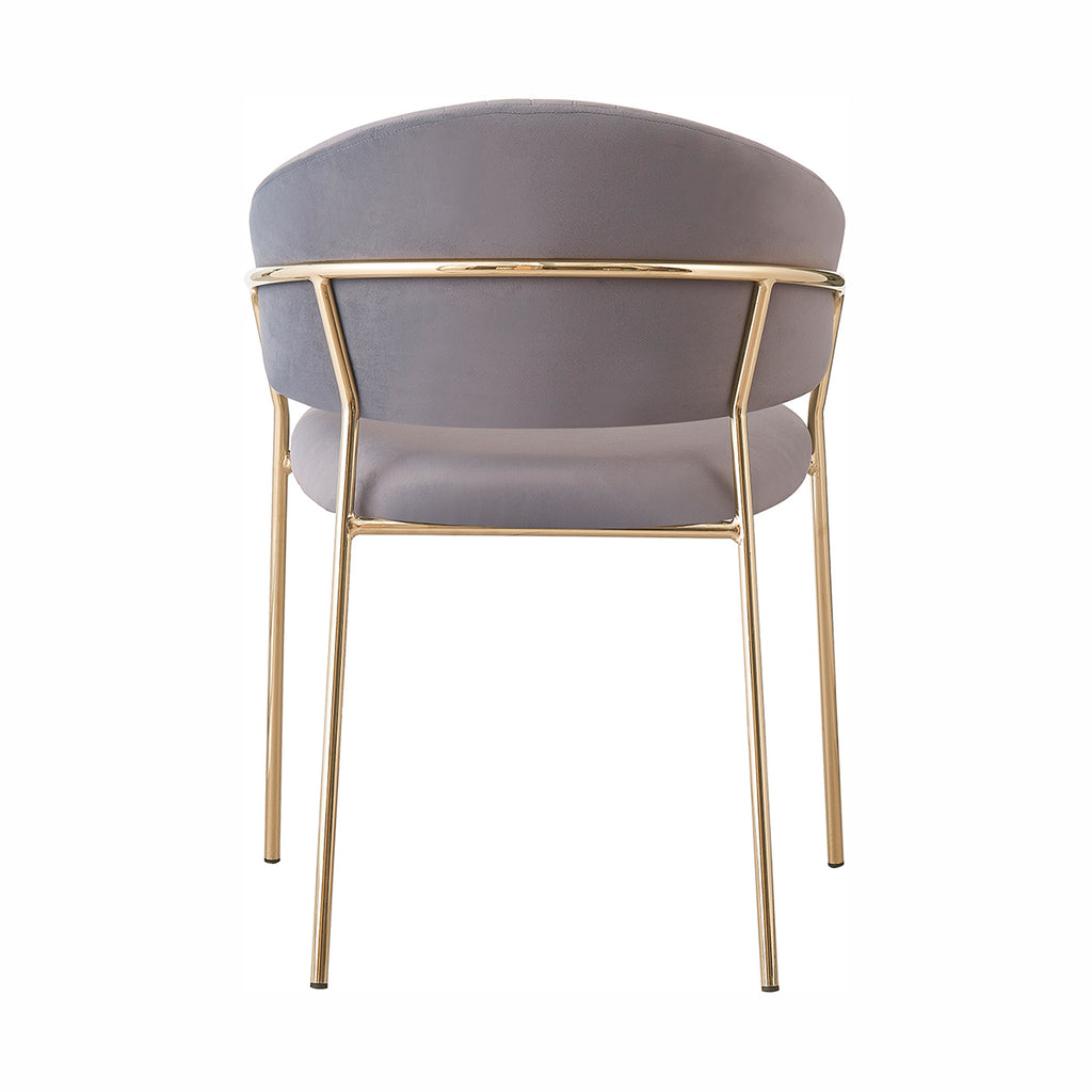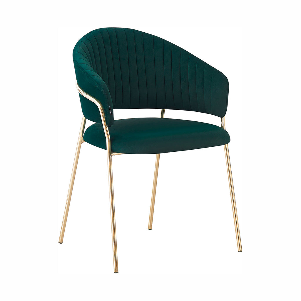 Las patas metálicas en acabado dorado aportan un toque de luz y contraste, convirtiendo a la Silla Bilbao en un punto focal dentro de cualquier comedor o rincón decorativo. La textura aterciopelada del tapizado realza la profundidad del color, generando un juego visual elegante y sutil. En conjunto, sus materiales equilibran lujo, suavidad y practicidad con una presencia ligera y refinada.