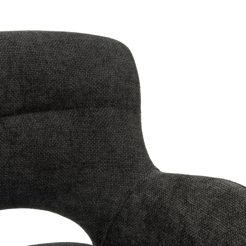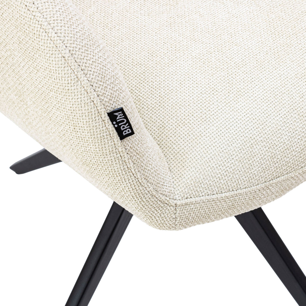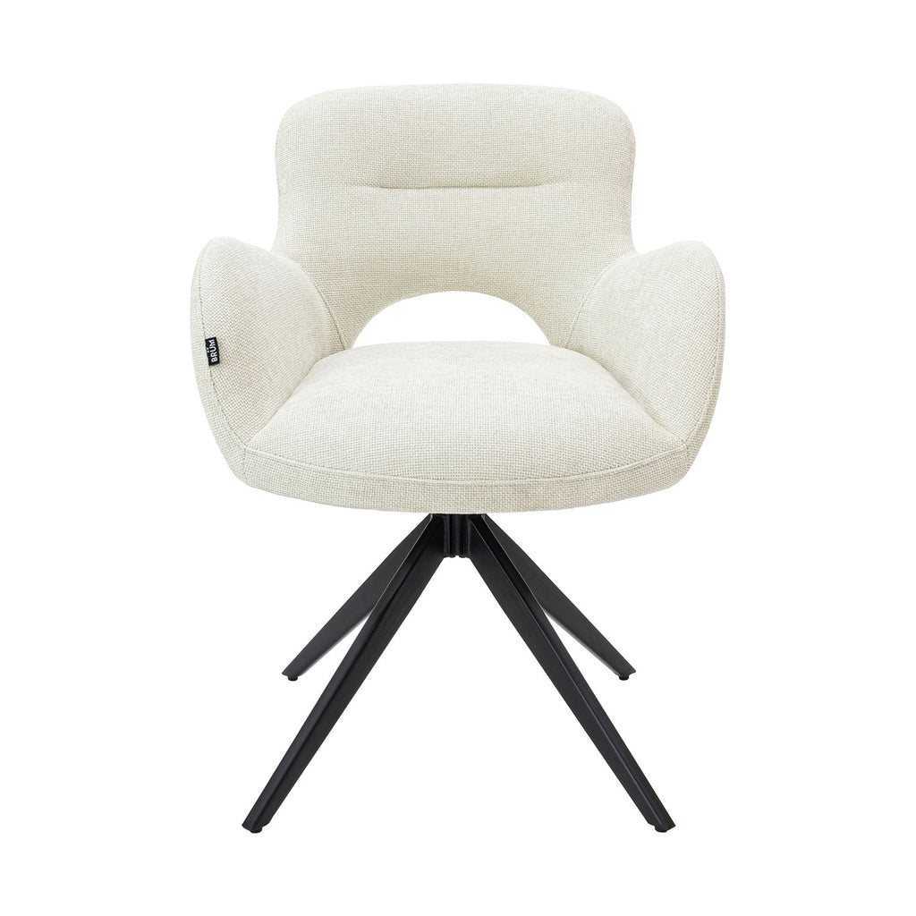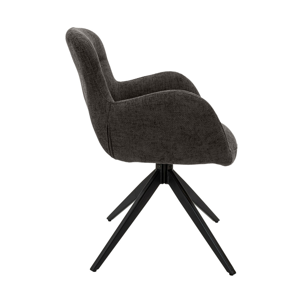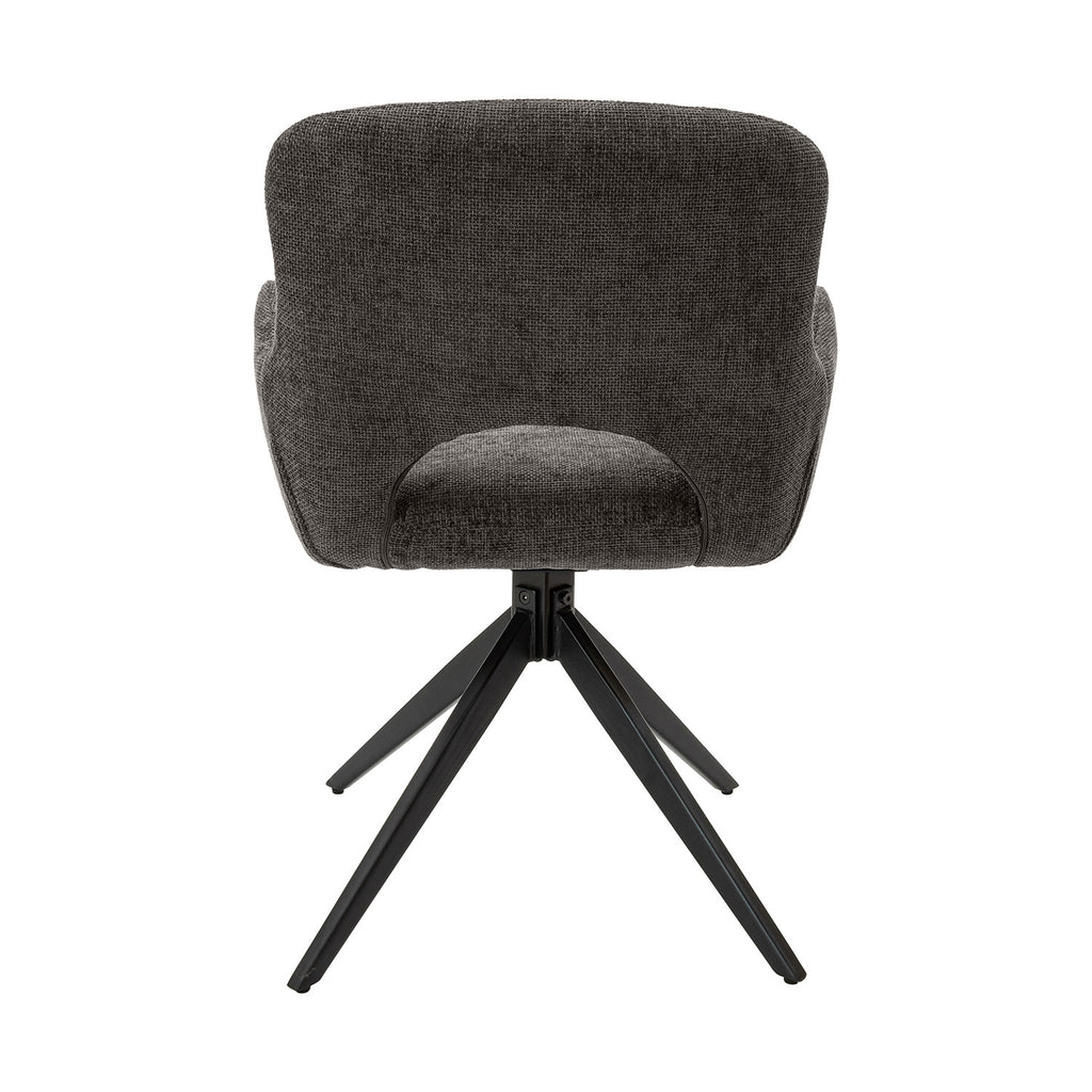Además, la silla Hamilton es giratoria hasta 180 grados, lo que te permite girar la silla con facilidad y comodidad para conversar con amigos y familiares o para disfrutar de tu programa de televisión favorito. Sus patas metálicas con acabado en polvo negro proporcionan una base sólida y resistente.
