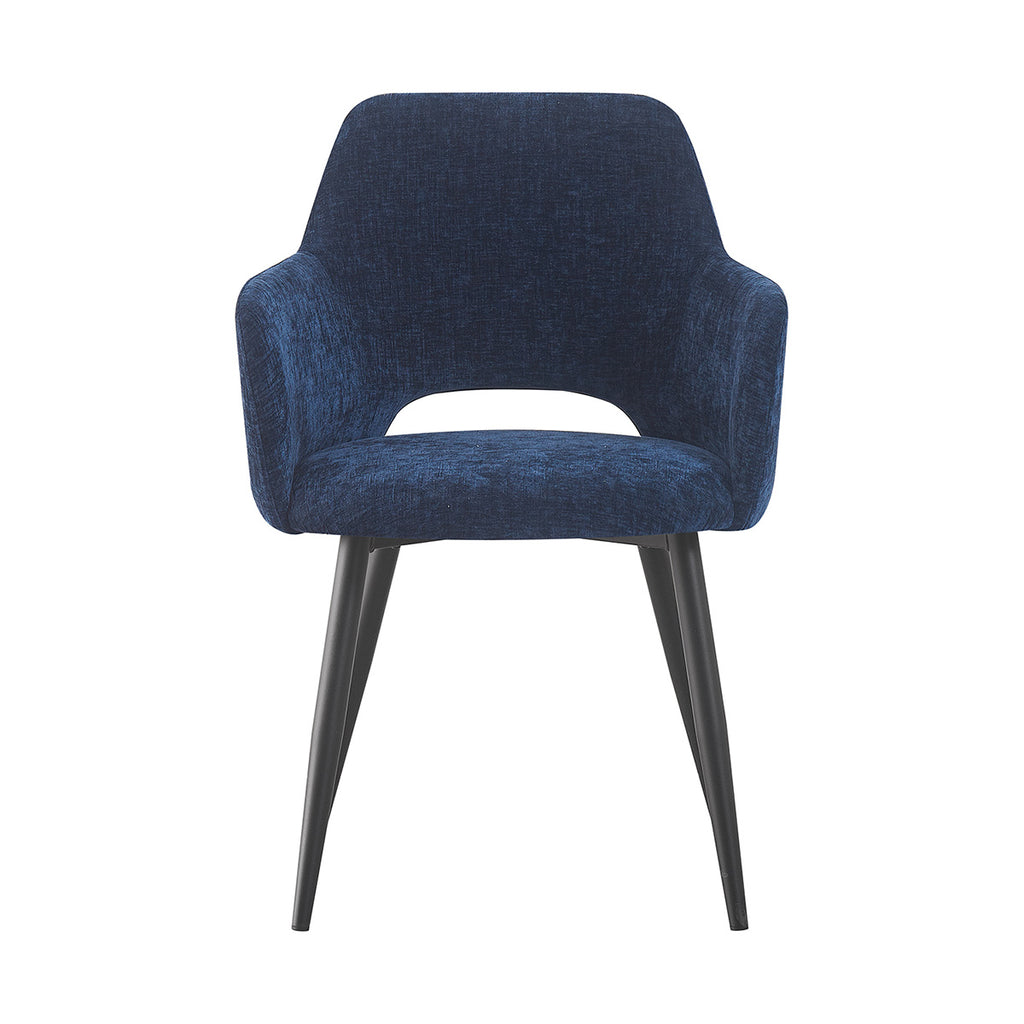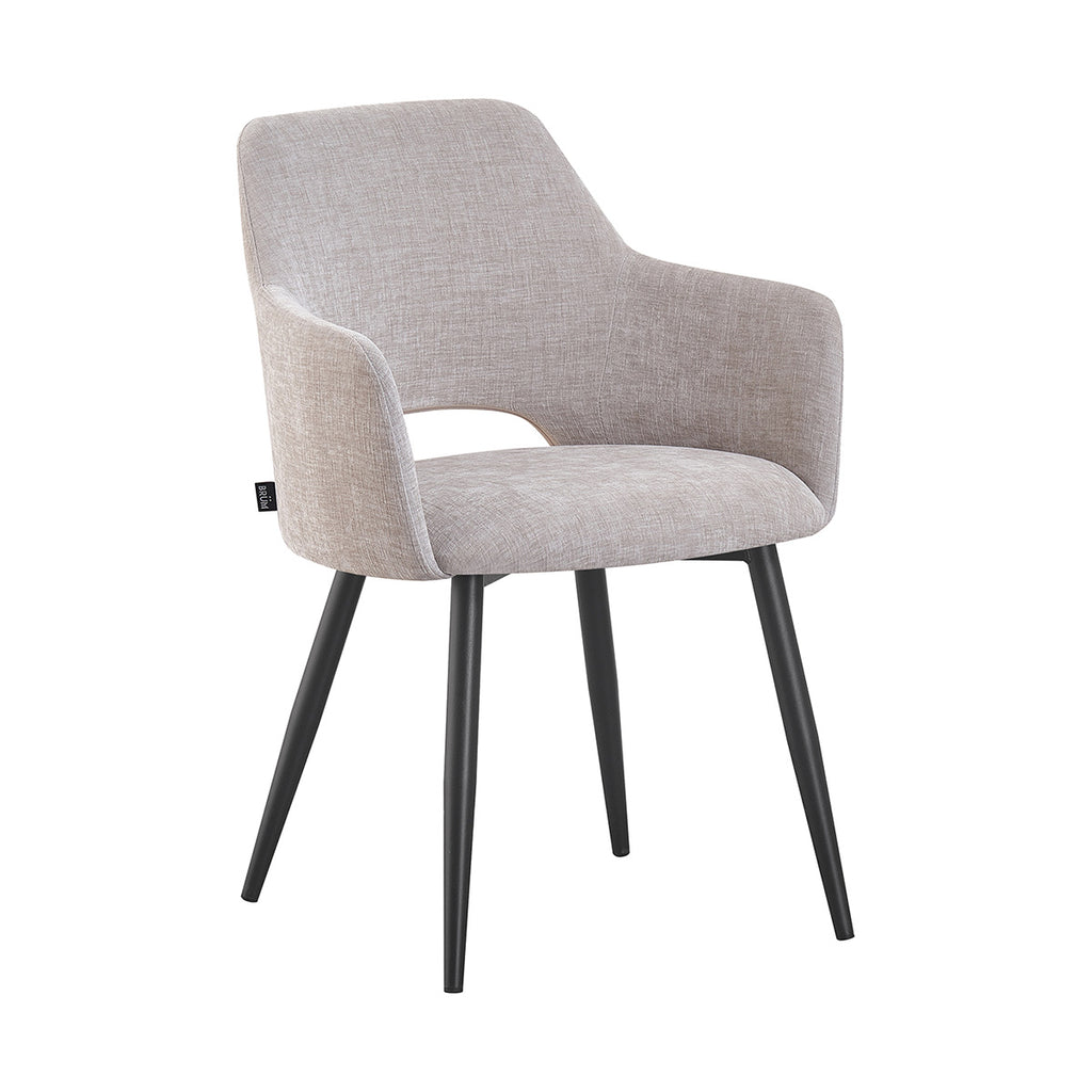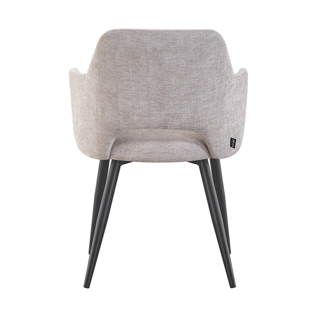 El asiento tapizado en tela de alta calidad proporciona una textura agradable y duradera, mientras que sus patas metálicas cónicas aportan estabilidad, ligereza visual y un toque moderno que eleva cualquier ambiente.