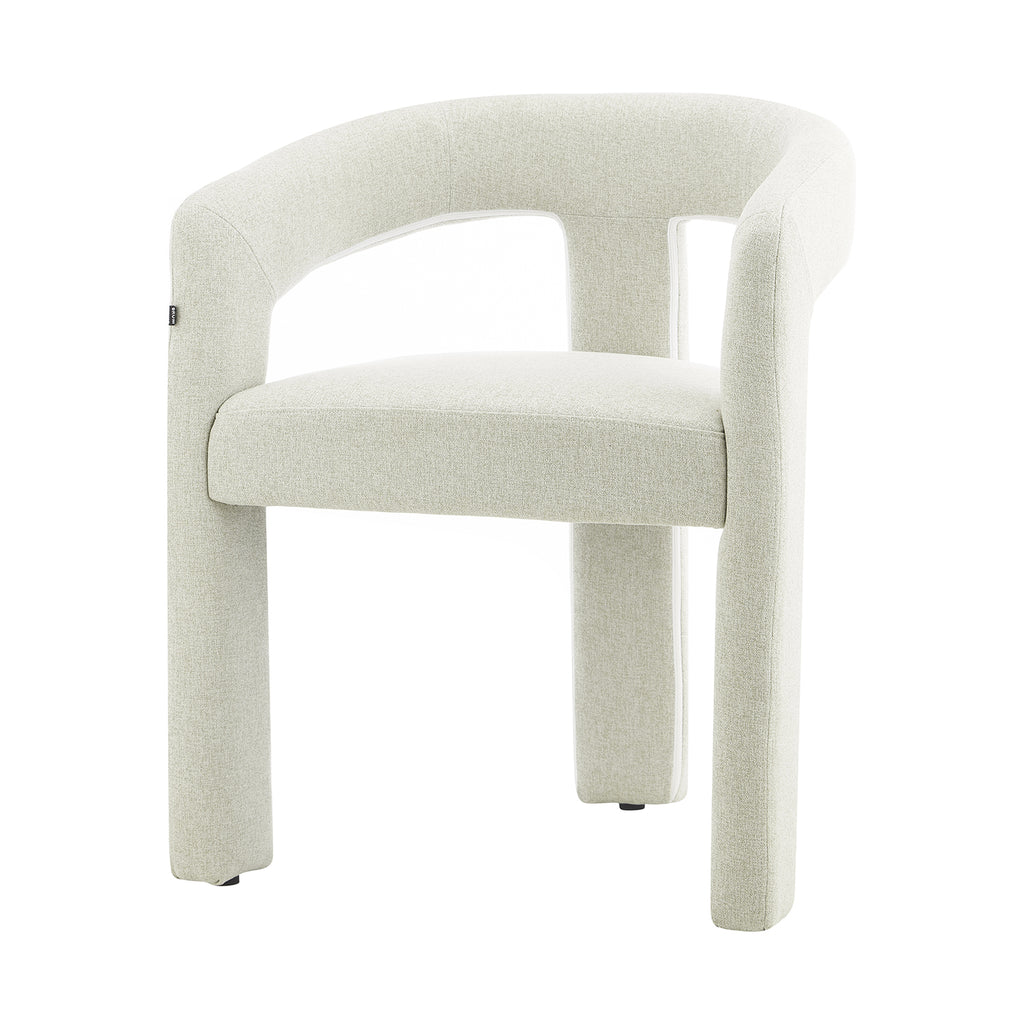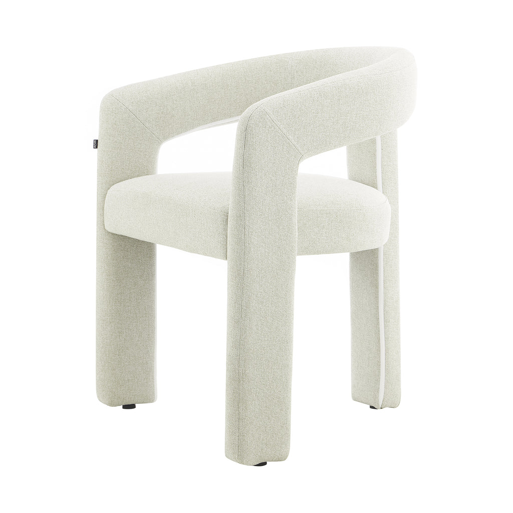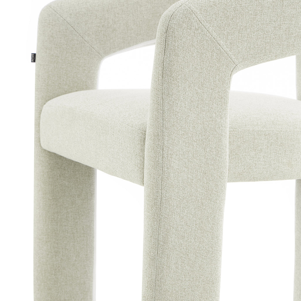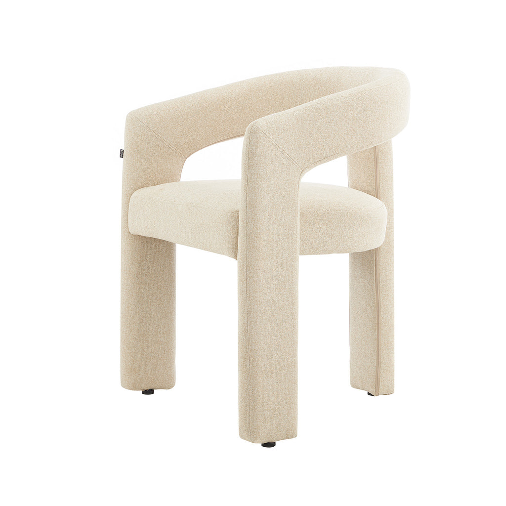 Tapizada en tela premium en tonos crema y beige, su textura aporta calidez y un toque de lujo. Su base estructural es firme y estable, garantizando durabilidad sin perder la ligereza visual que la caracteriza. Su diseño abierto en el respaldo añade frescura y fluidez, creando una sensación de amplitud en cualquier espacio.