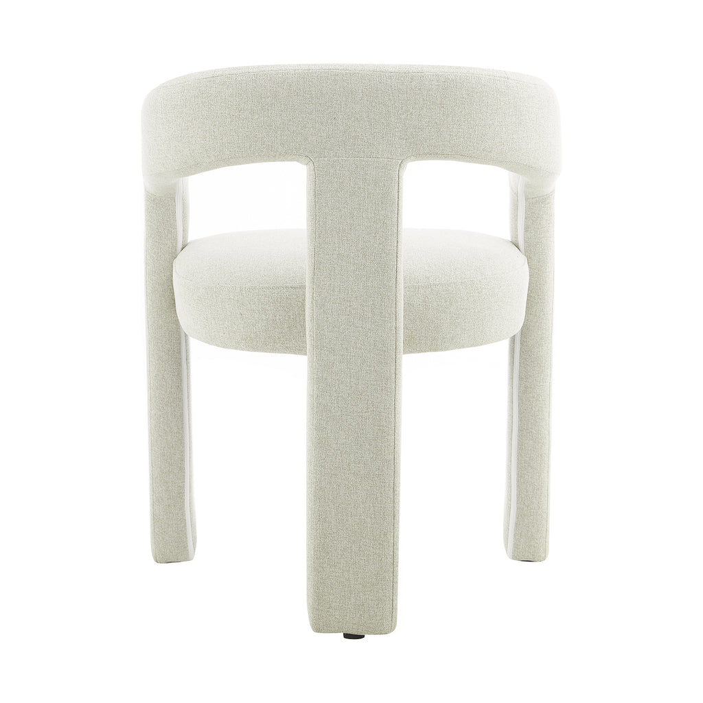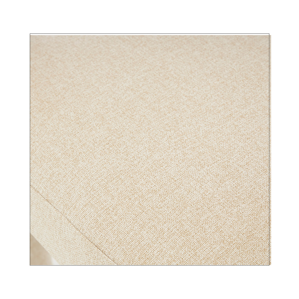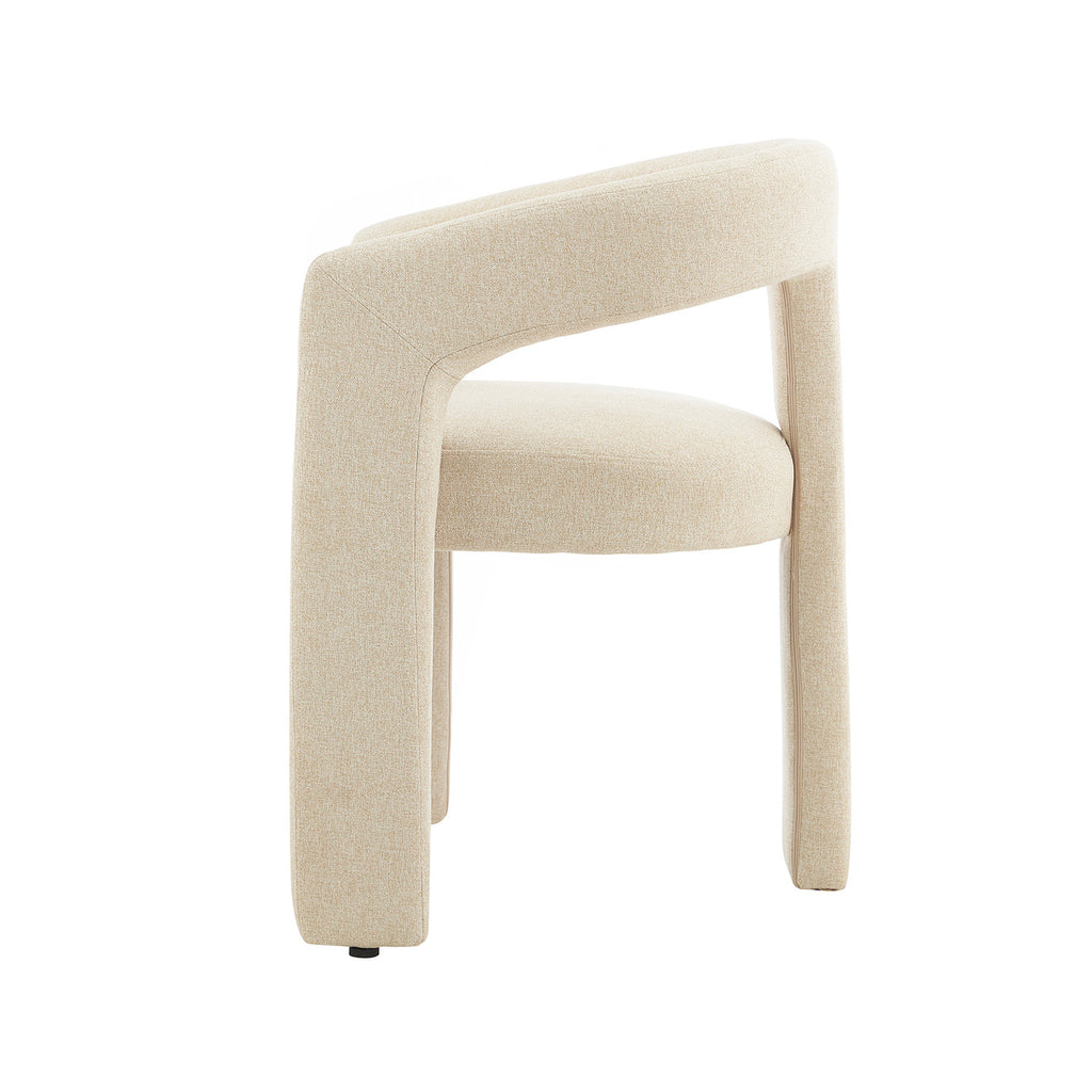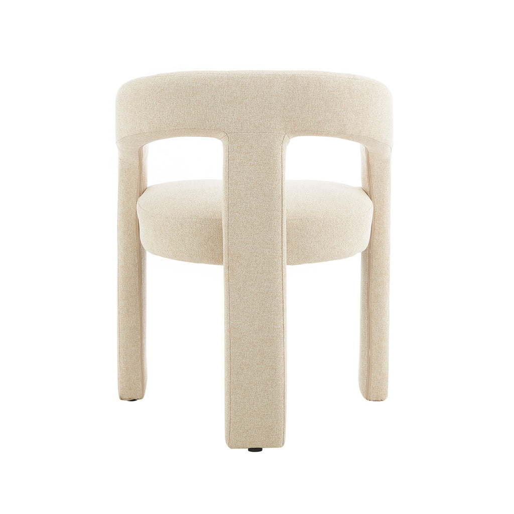 Tapizada en tela premium en tonos crema y beige, su textura aporta calidez y un toque de lujo. Su base estructural es firme y estable, garantizando durabilidad sin perder la ligereza visual que la caracteriza. Su diseño abierto en el respaldo añade frescura y fluidez, creando una sensación de amplitud en cualquier espacio.