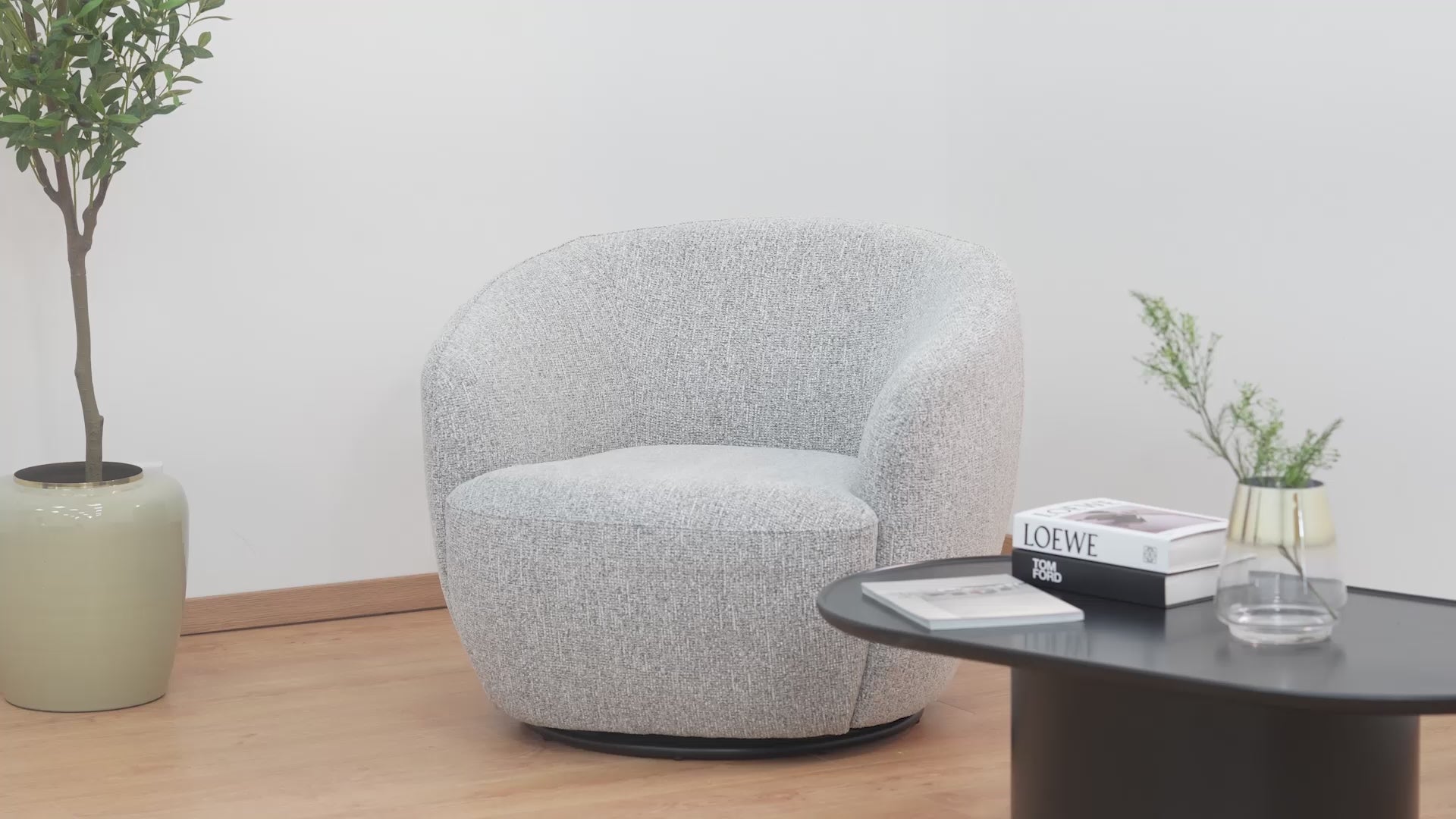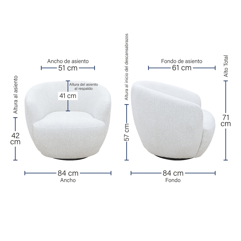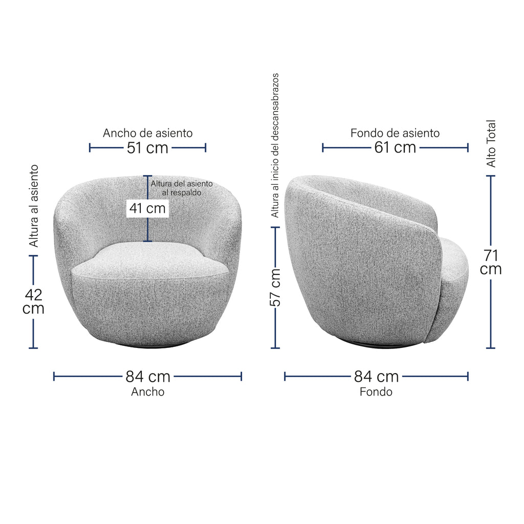 Este sillón cuenta con un diseño moderno y acogedor, ideal para complementar cualquier espacio contemporáneo. Con un respaldo envolvente y suaves curvas, proporciona un excelente soporte y comodidad al sentarse. El sillón dispone de un sistema giratorio que permite una rotación de 360 grados, lo que lo hace perfecto para áreas sociales o de descanso.