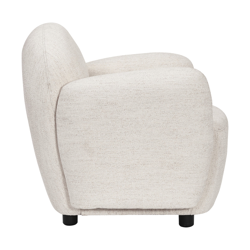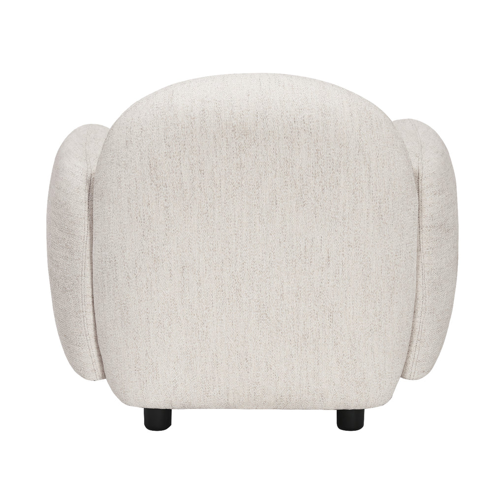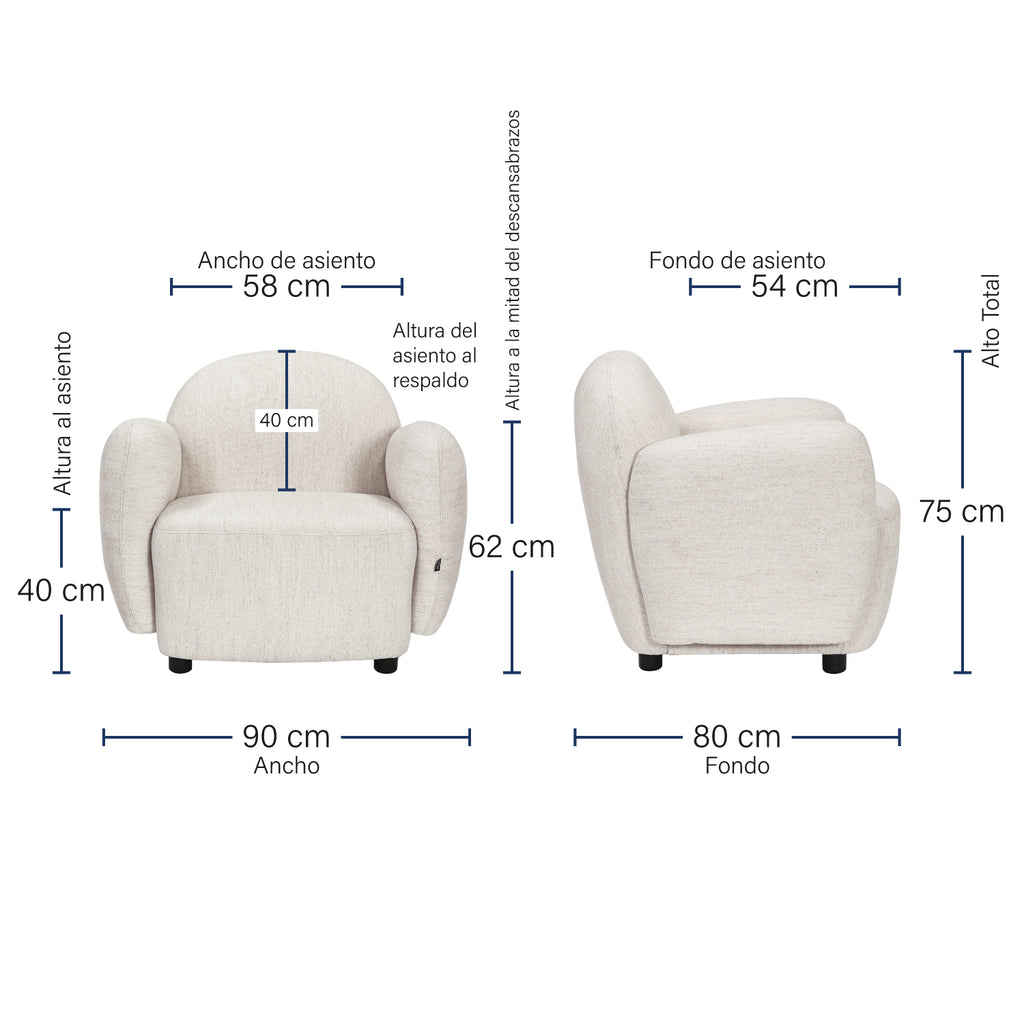 El asiento profundo y el acolchado suave generan una textura acogedora que invita al descanso, mientras que sus descansabrazos brindan un soporte ergonómico ideal para largas horas de lectura, conversación o relajación. Todo el conjunto descansa sobre patas cilíndricas bajas que aportan estabilidad sin romper la estética minimalista.