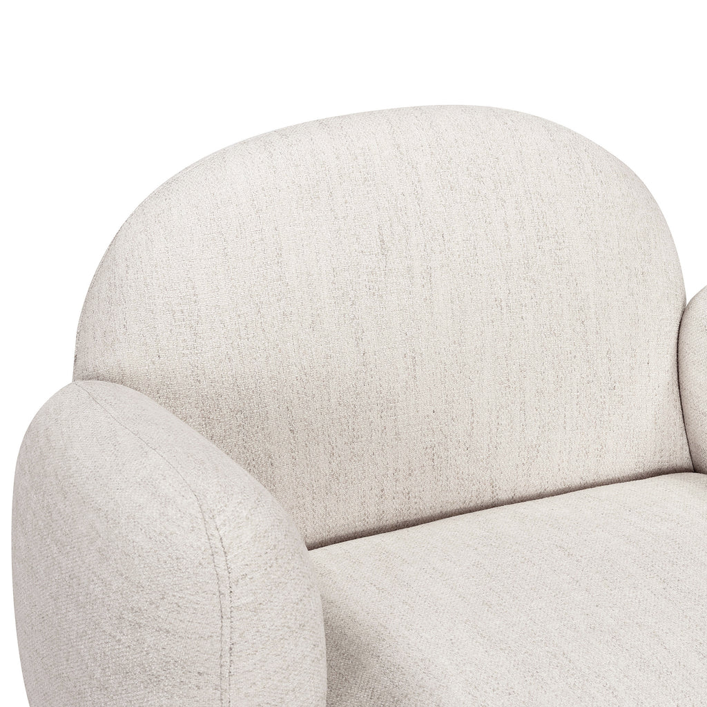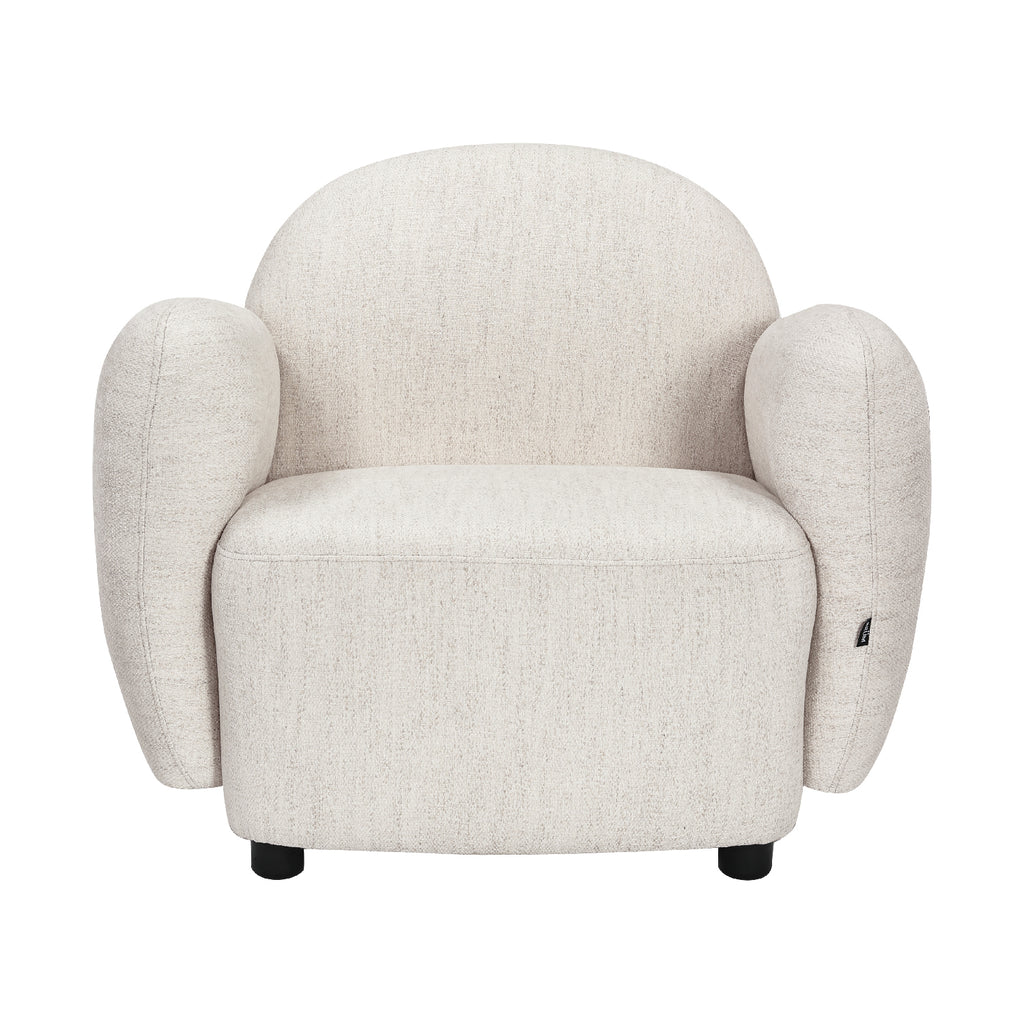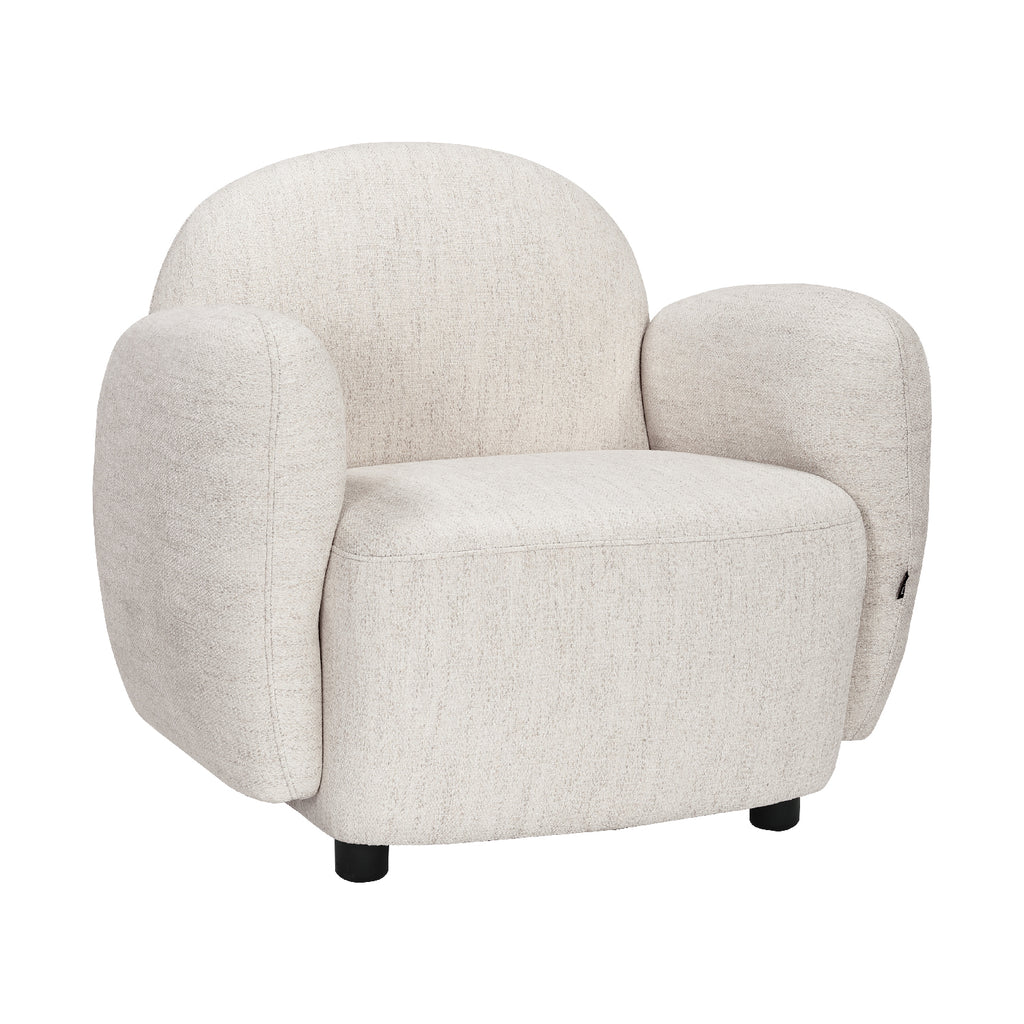 El asiento profundo y el acolchado suave generan una textura acogedora que invita al descanso, mientras que sus descansabrazos brindan un soporte ergonómico ideal para largas horas de lectura, conversación o relajación. Todo el conjunto descansa sobre patas cilíndricas bajas que aportan estabilidad sin romper la estética minimalista.