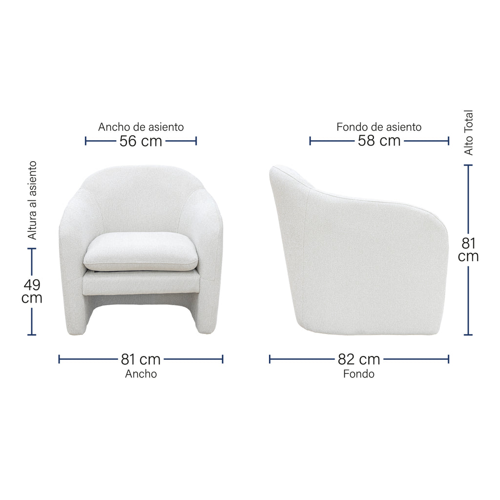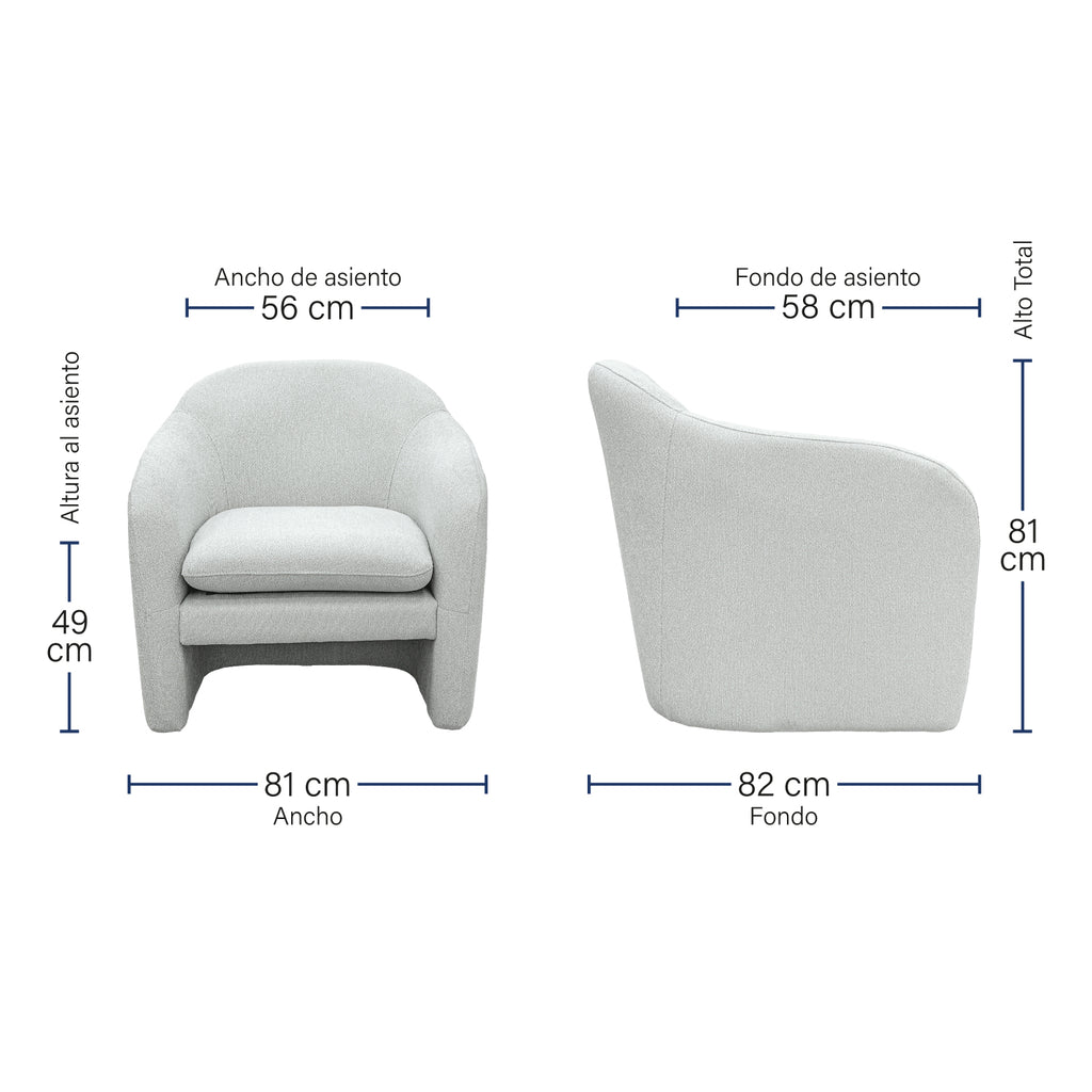 Este sillón se caracteriza por su diseño contemporáneo con líneas suaves y redondeadas que le otorgan un aspecto acogedor y moderno. Su respaldo ligeramente inclinado y su asiento profundo y acolchado garantizan una experiencia de confort superior, ideal para relajarse después de un largo día.