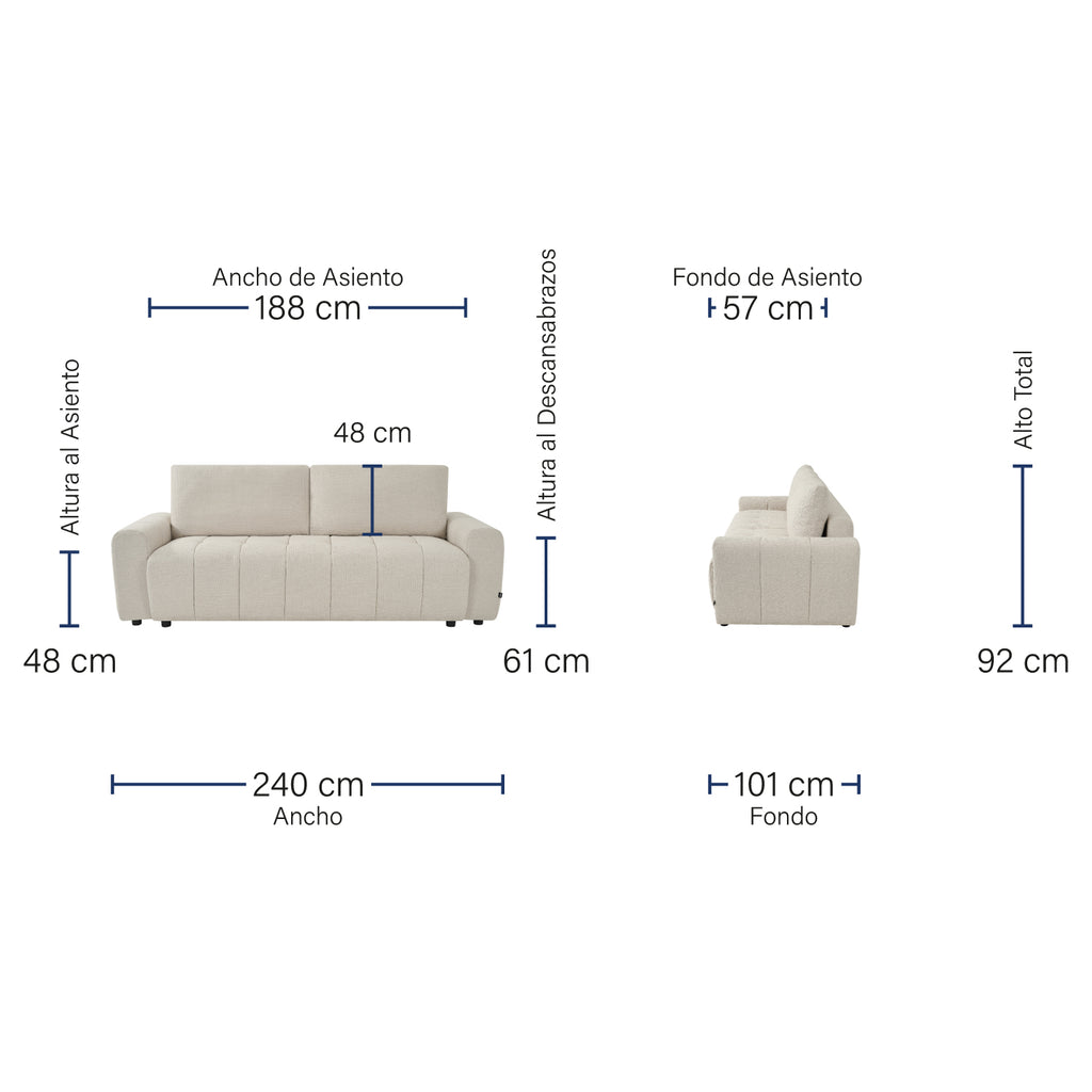 Dimensiones Generosas: En su estado de sofá tiene, ofrece amplio espacio para relajarse con 240 cm de ancho, 101 cm de profundidad y 92 cm de altura.